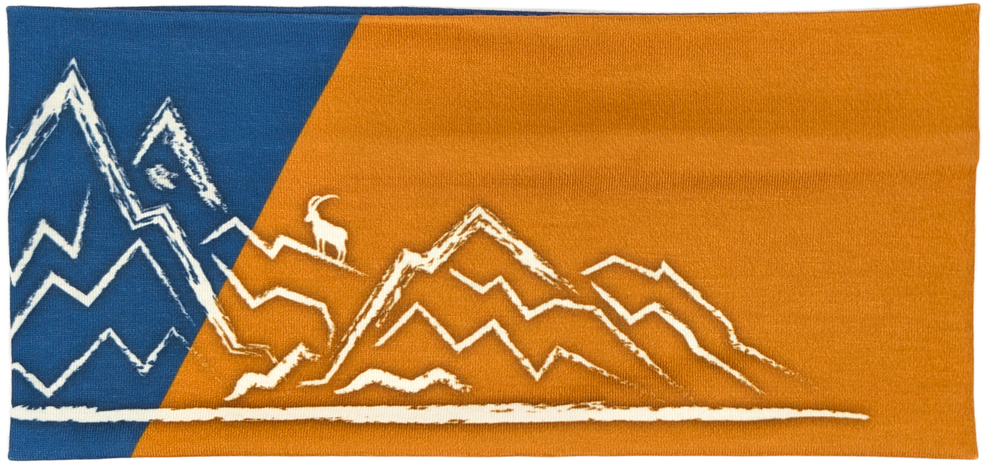 Dieses Stirnband kombiniert ein mittleres Jeansblau mit einem diagonalen Einsatz in warmem Senforange. Die cremefarbene, skizzenhafte Berglandschaft mit kleiner Sonne und einem Steinbock auf einem der Gipfel sorgt für einen sportlich-alpinen Look.