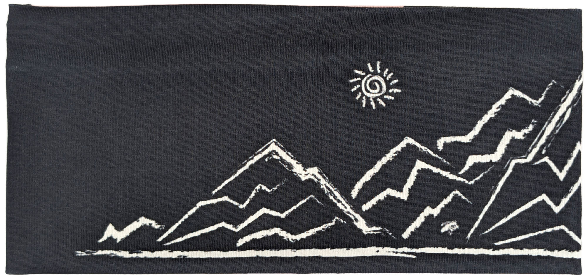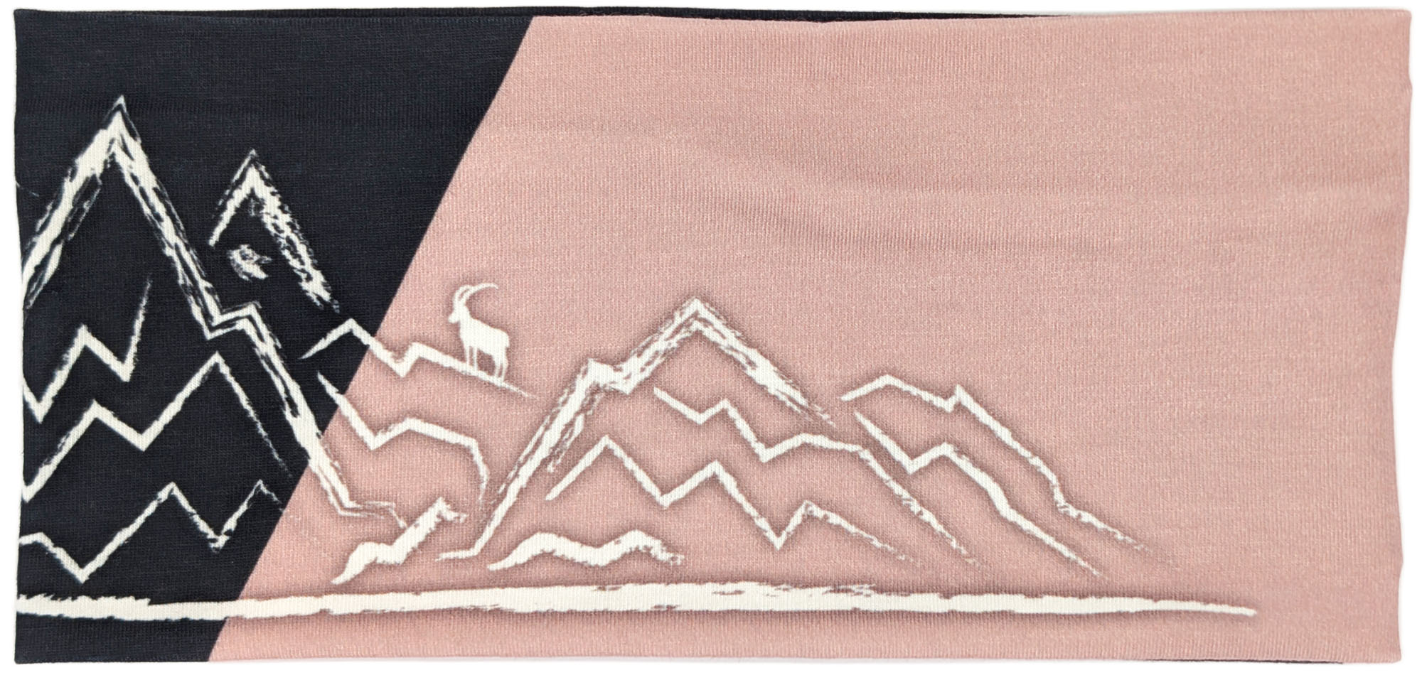 Dieses Stirnband kombiniert ein dunkles Anthrazit mit einem diagonalen Einsatz in zartem Altrosa. Die cremefarbene, skizzenhafte Berglandschaft mit kleiner Sonne und einem Steinbock auf einem der Gipfel verleiht ihm einen stilvollen, alpinen Look.