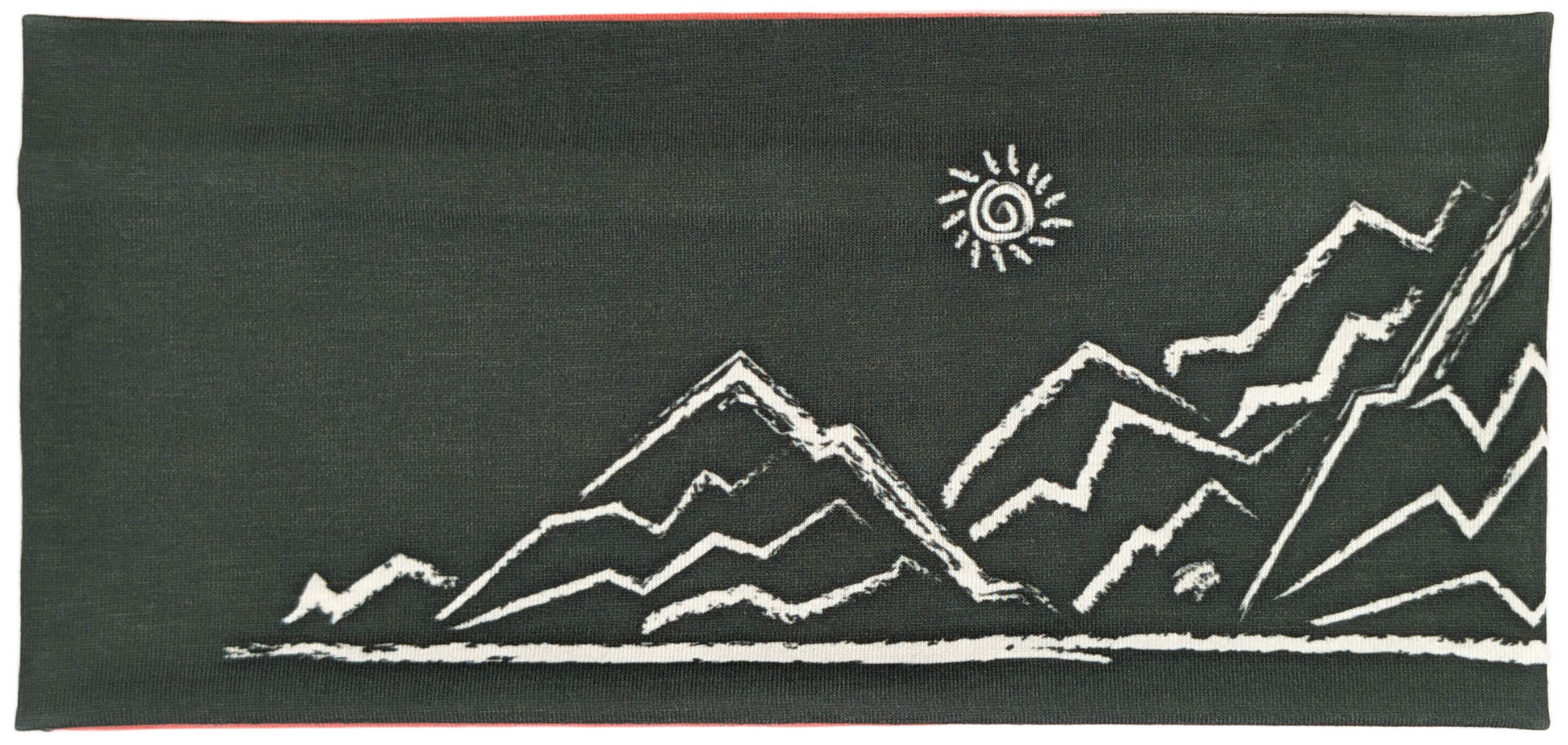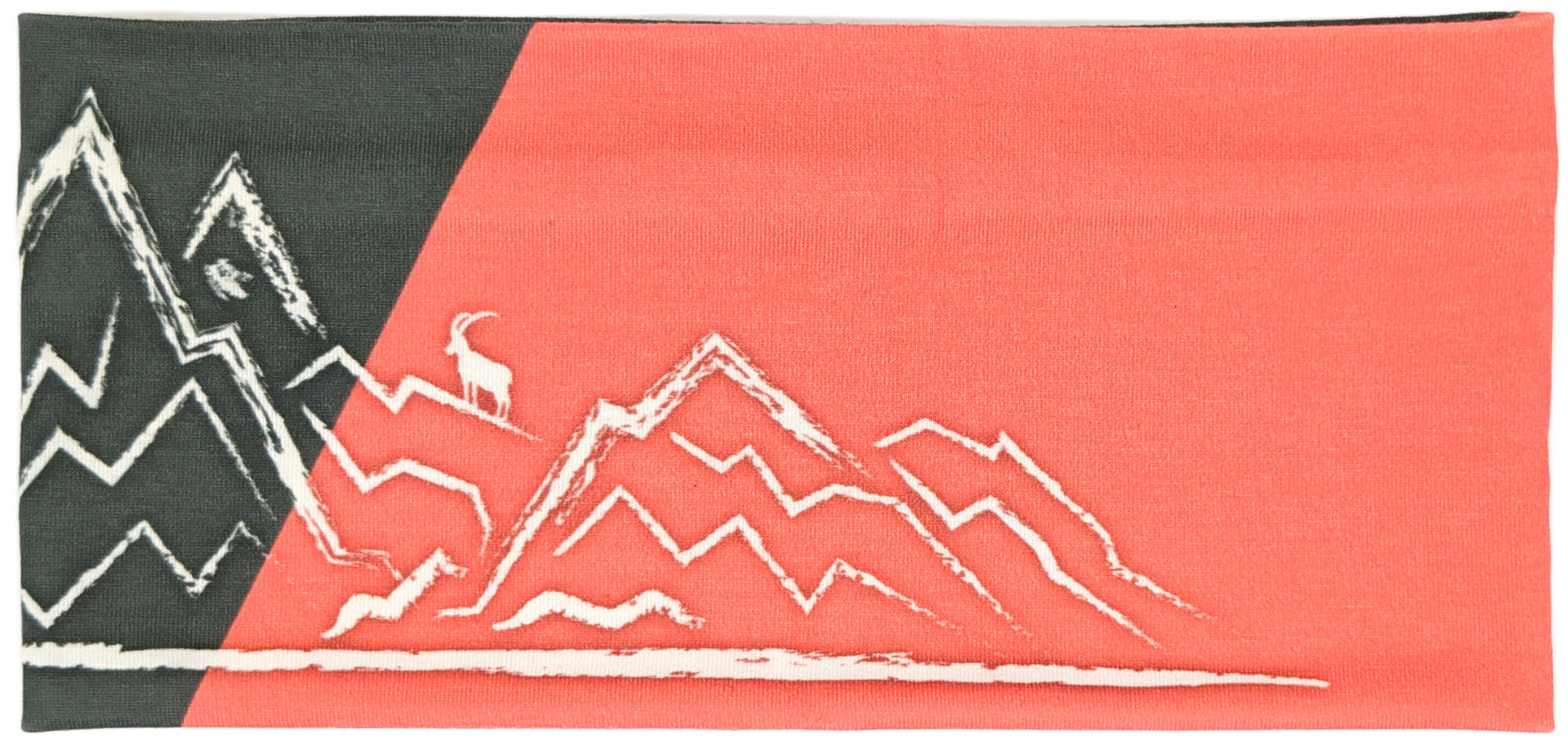 Dieses Stirnband kombiniert ein dunkles Graugrün mit einem diagonalen Einsatz in leuchtendem Korallton. Die cremefarbene, skizzenhafte Berglandschaft mit kleiner Sonne und einem Steinbock auf einem der Gipfel sorgt für einen modernen, alpinen Look.