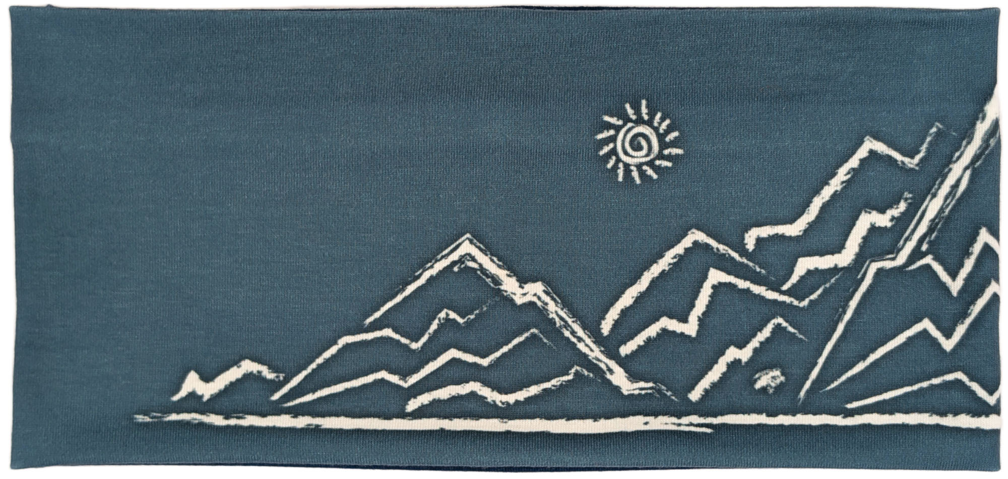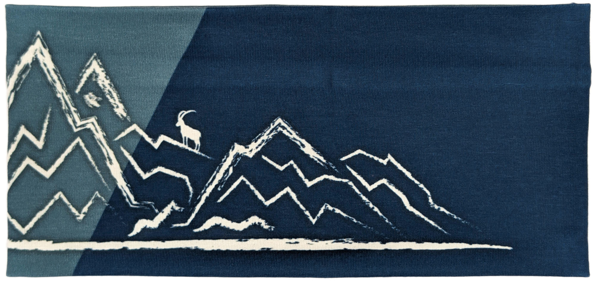 Dieses Stirnband kombiniert ein gedämpftes Jeansblau mit einem diagonalen Einsatz in dunklem Marineblau. Die cremefarbene, skizzenhafte Berglandschaft mit kleiner Sonne und einem Steinbock auf einem der Gipfel sorgt für einen dezenten, alpinen Look.