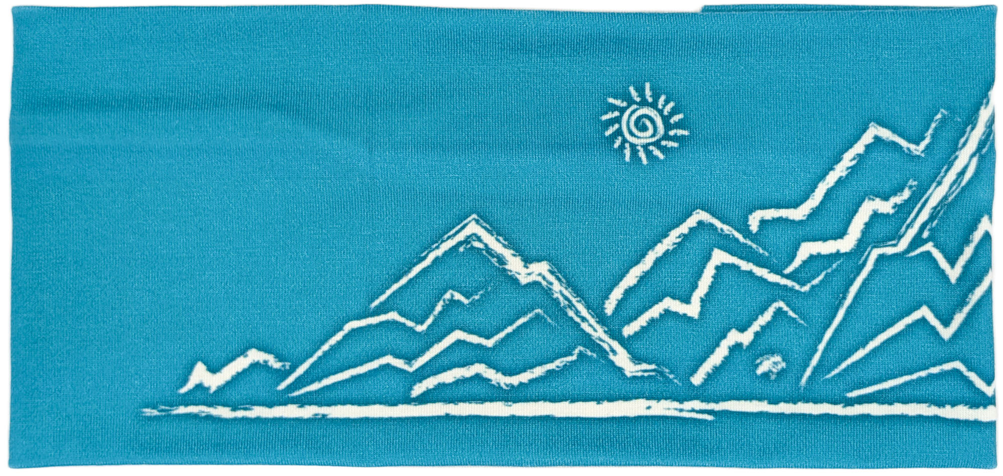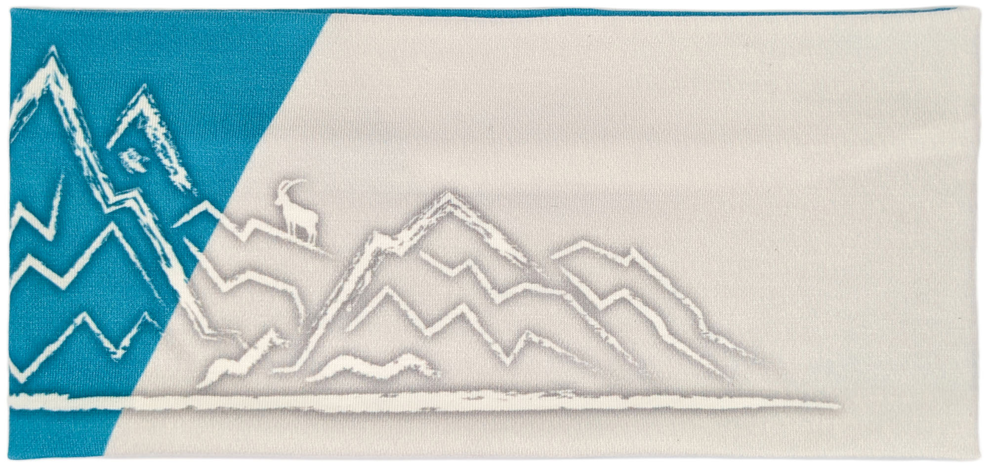Dieses Stirnband kombiniert frisches Türkisblau mit einem diagonalen Einsatz in sehr hellem Grau. Die cremefarbene, skizzenhafte Berglandschaft mit kleiner Sonne und einem Steinbock auf einem der Gipfel sorgt für einen klaren, alpinen Look.
