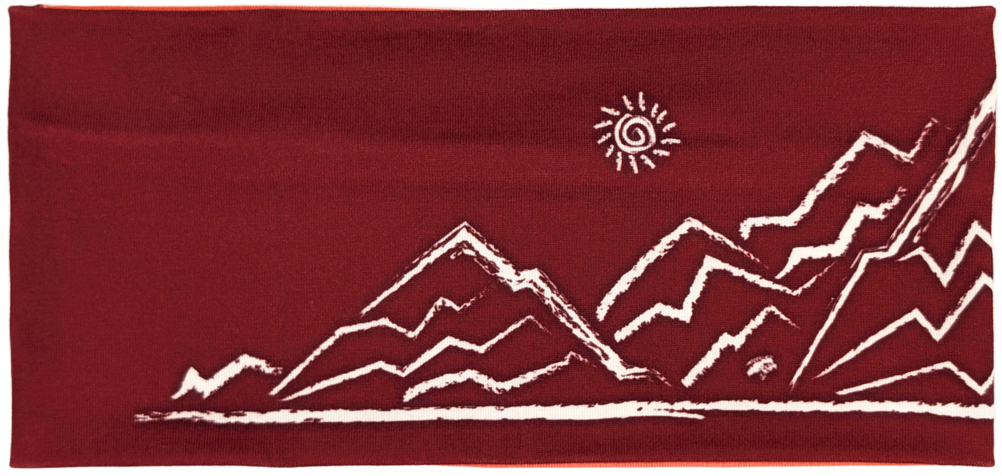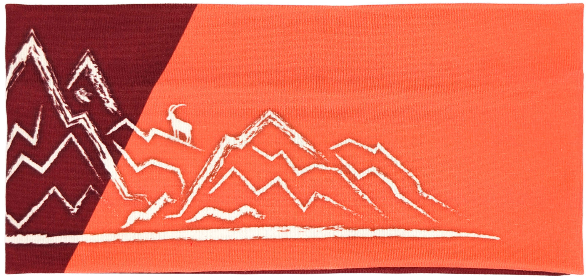 Dieses Stirnband kombiniert ein tiefes Bordeauxrot mit einem diagonalen Einsatz in leuchtendem Orange. Die cremefarbene, skizzenhafte Berglandschaft mit kleiner Sonne und einem Steinbock auf einem der Gipfel verleiht ihm einen warmen, alpinen Look.