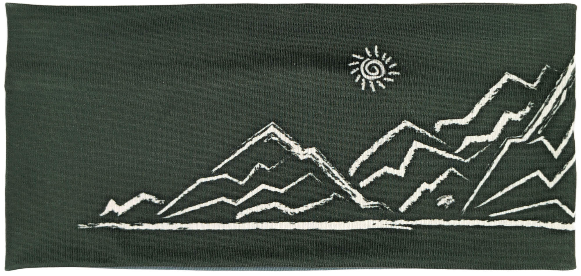 Dieses Stirnband kombiniert ein dunkles Tannengrün mit einem diagonalen Einsatz in gedecktem Blaugrau. Die cremeweiße, skizzenhafte Berglandschaft mit kleiner Sonne und einem Steinbock auf einem der Gipfel sorgt für einen ruhigen, alpinen Look.