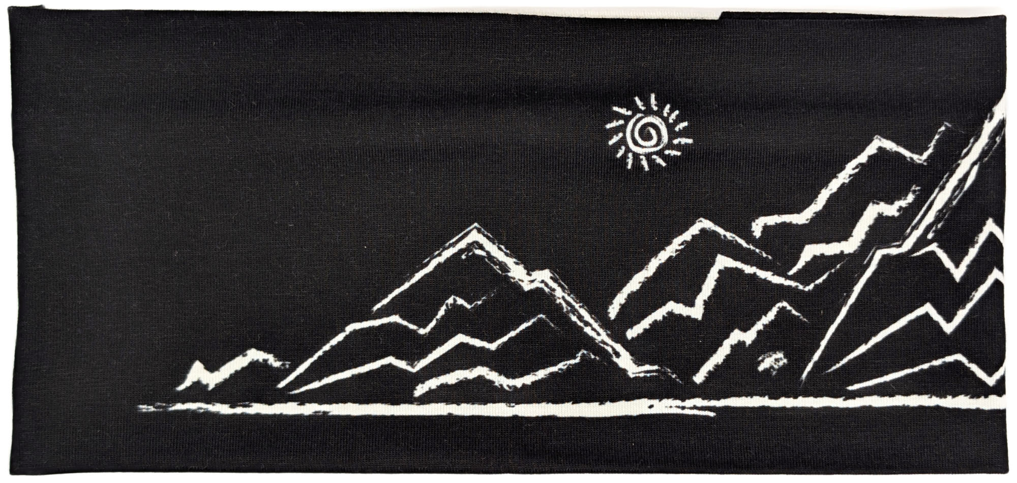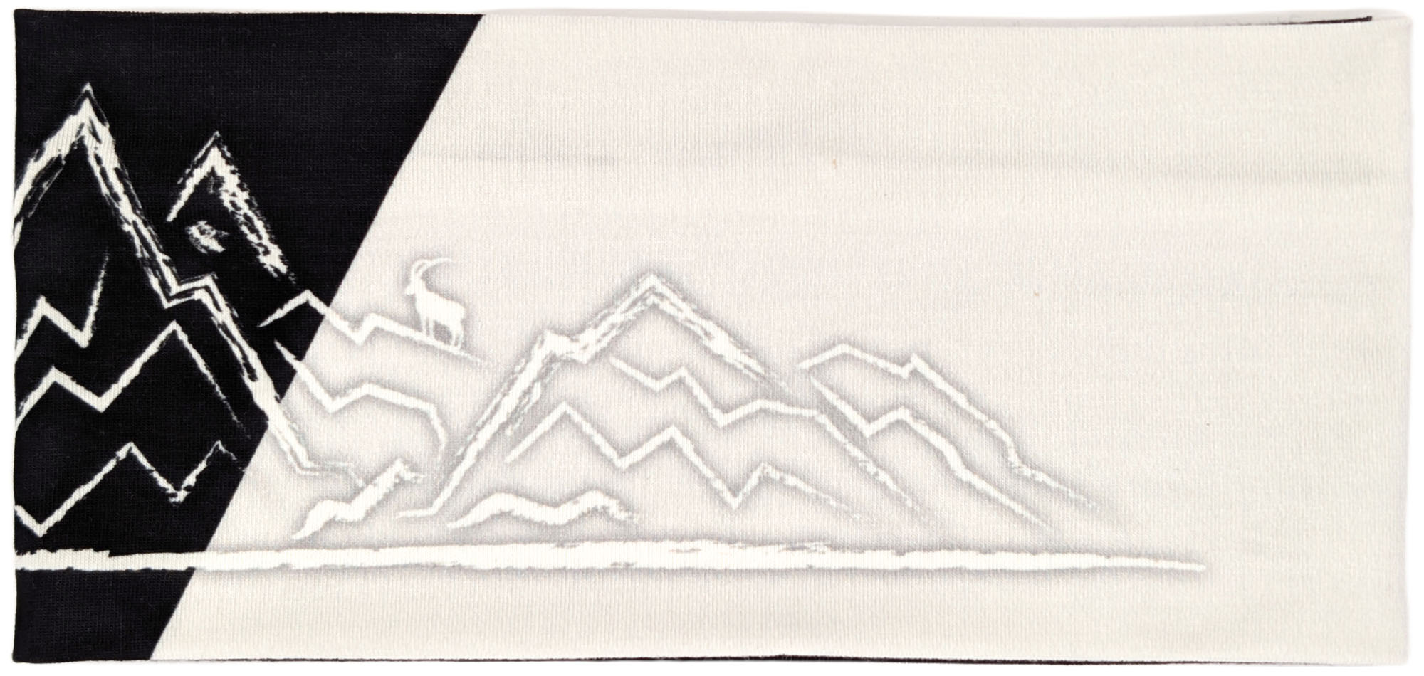 Dieses Stirnband kombiniert tiefes Schwarz mit einem diagonalen Einsatz in hellem Cremeweiß. Die kontrastreiche, skizzenhafte Berglandschaft mit kleiner Sonne und einem Steinbock auf einem der Gipfel sorgt für einen klaren, alpinen Look.