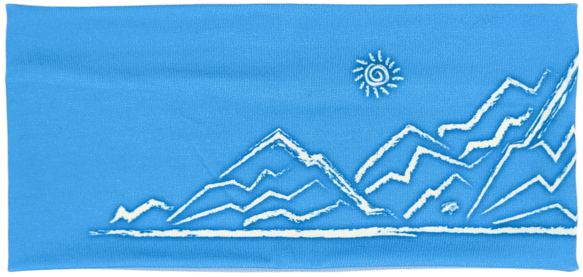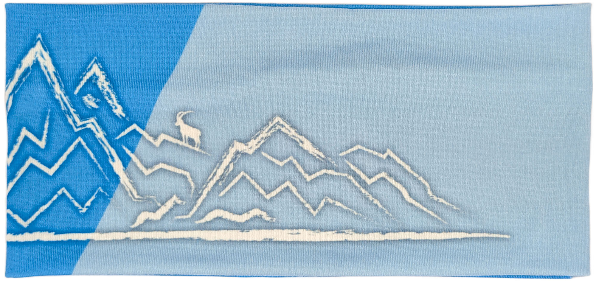 Dieses Stirnband kombiniert strahlendes Himmelblau mit einem diagonalen Einsatz in hellem Eisblau. Die cremeweiße, skizzenhafte Berglandschaft mit kleiner Sonne und einem Steinbock auf einem der Gipfel verleiht dem Design einen frischen, alpinen Look.